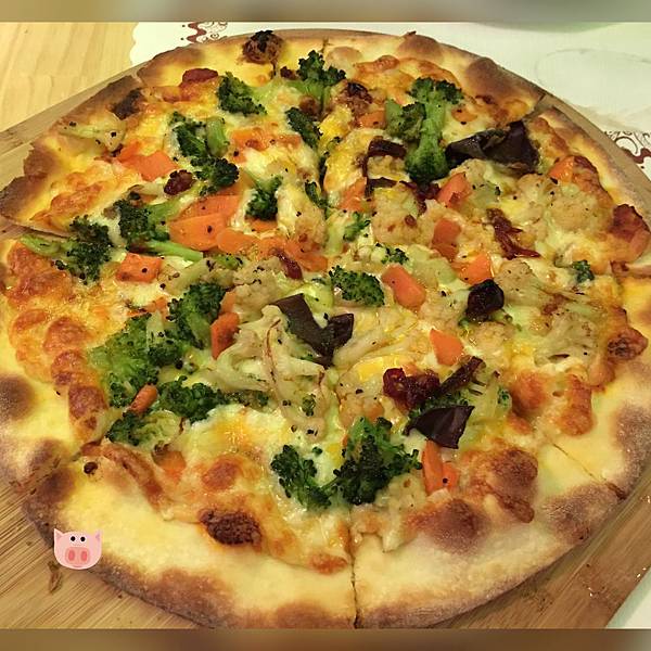 酥脆的披薩餅皮,上頭擺著滿滿的蔬菜配料,